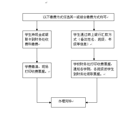 学生通过网上银行汇款方式(备注姓名、班级、年级等信息) 学生持现金或银联卡到财务处收费科缴费 学费缴清,现场打印收费票据。 学校财务处打印收费票据,通知各学院,各班级的学生到财务处领取票据。 以下缴费方式任选其一或组合缴费方式均可 办理完毕